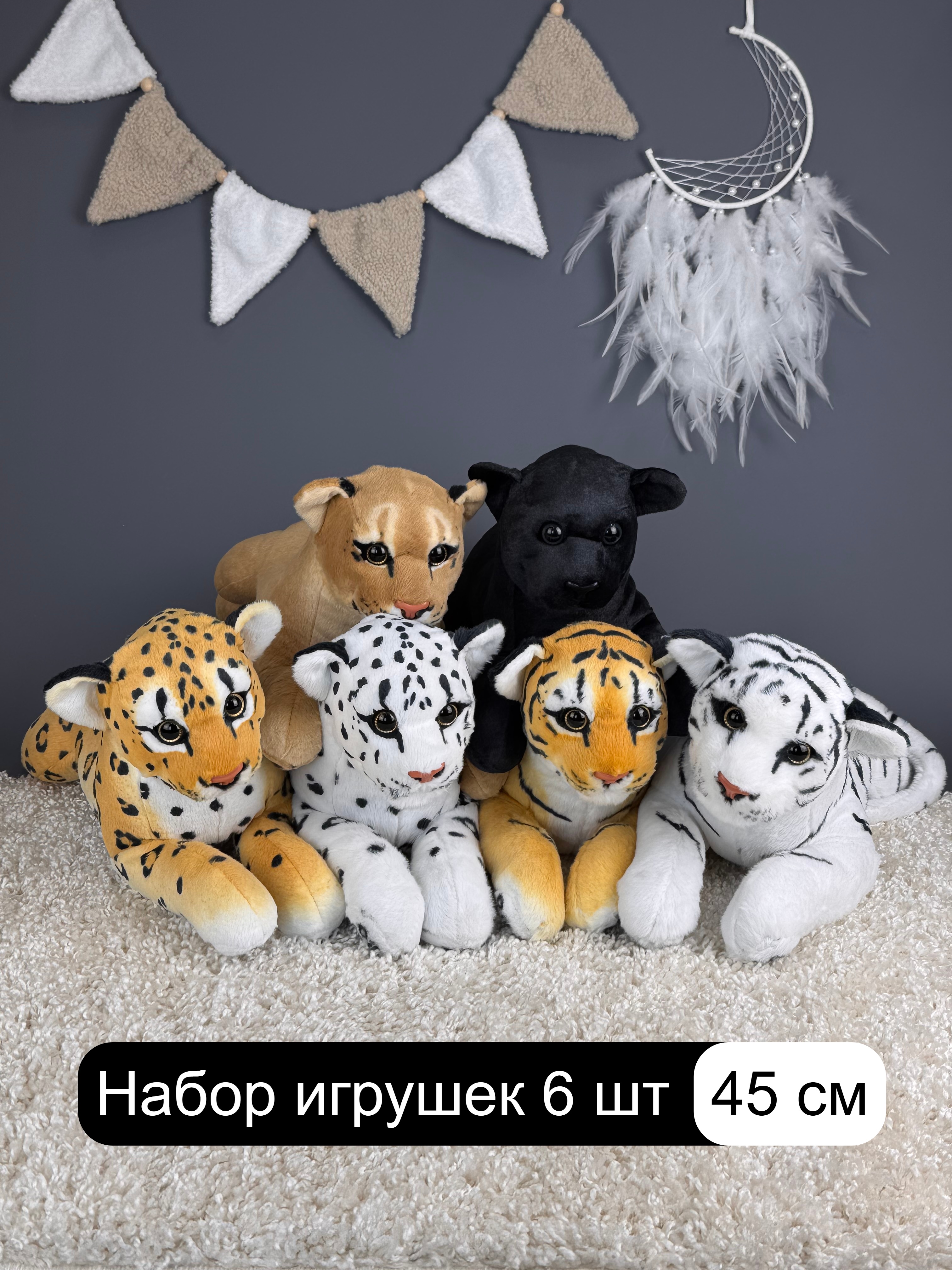 Набор игрушек 6 шт по 45см: тигр, белый тигр ,леопард ,белый леопард ,львица ,черная пантера